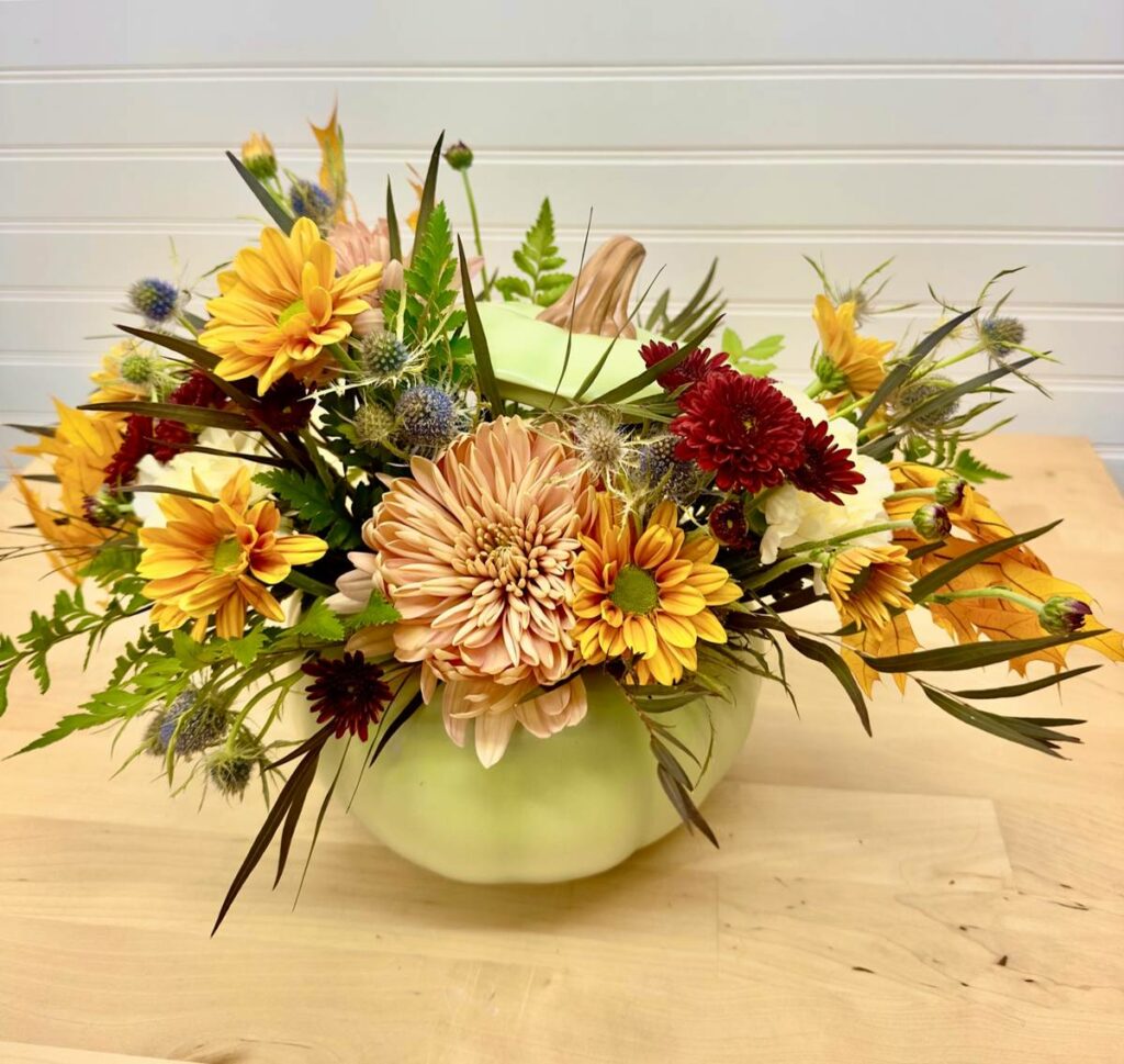 Lush Fall blooms artfully arranged in a soft sage colored ceramic pumpkin. This ceramic pumpkin container comes with a lid and can be used as a cute candy jar keepsake after the flowers have expired.