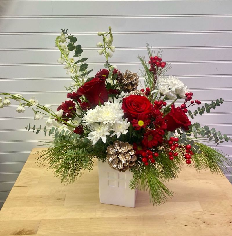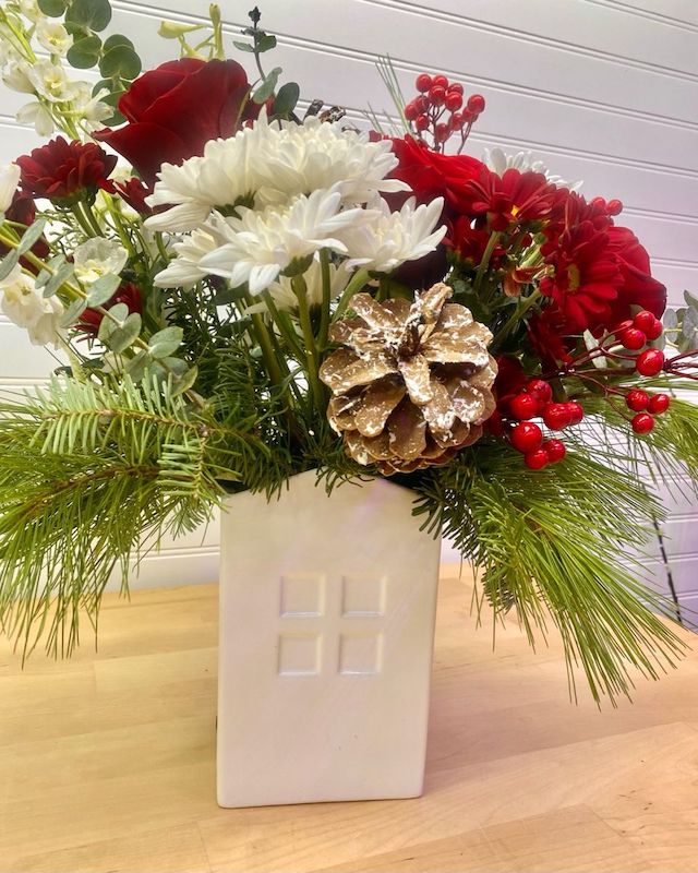 Designed in a modern white ceramic vessel, this arrangement will surely bring a bright, elegant flair to any space. Crisp white blooms, winter greens, roses, and pine cones make this perfect for the Holidays. This keepsake vessel can also be reused later as a stylish utensil holder.