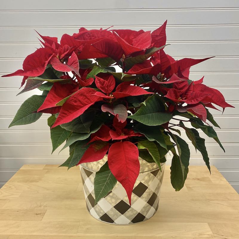 Our pointsettia plants come in two size variations, Standard and Premium. Both are showcased in a festive container.