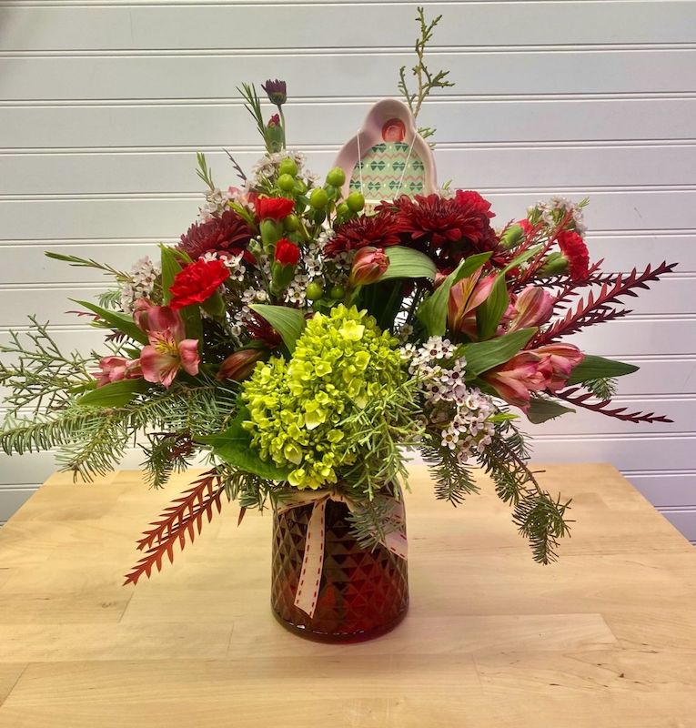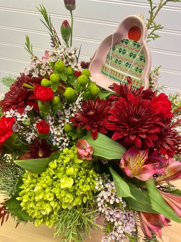 A Joyful arrangement designed with cheery bright seasonal blooms and mixed evergreens! Tucked in this arrangement is a whimsical ceramic candy dish - perfect for gifting!